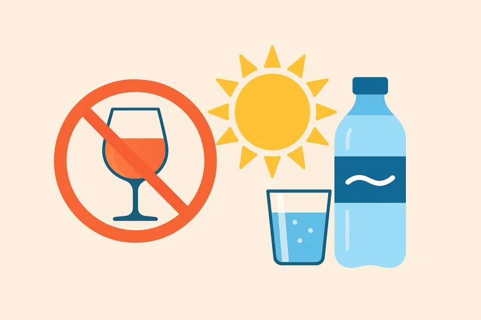 L’alcool agit comme un diurétique, ce qui accélère la déshydratation en faisant uriner davantage. Il peut également faire baisser la tension artérielle et augmenter le risque de malaise, de perte de connaissance ou d’accident.