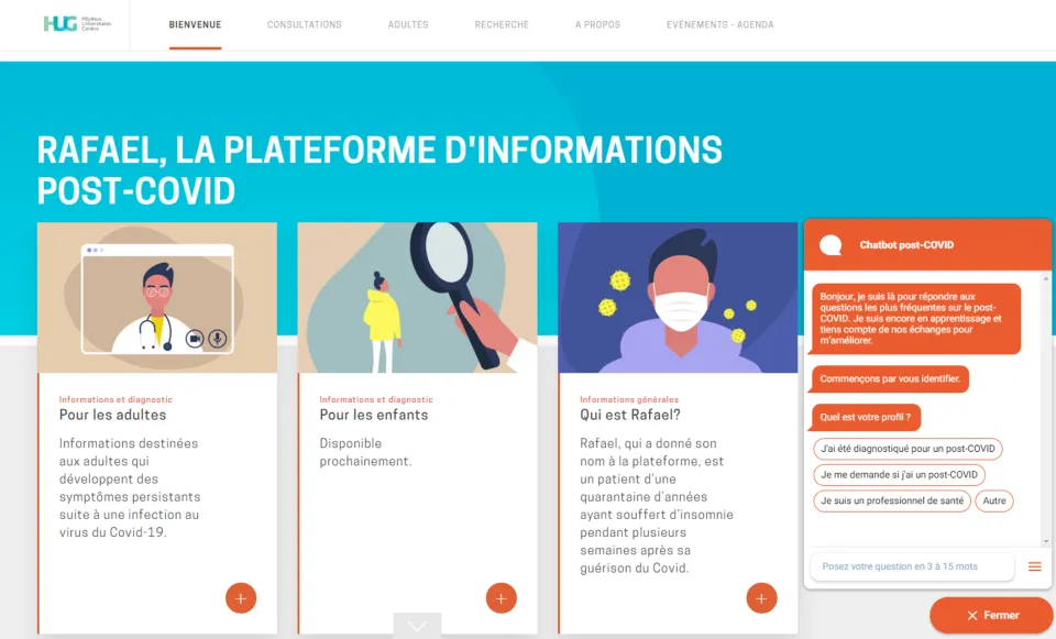Lancé en novembre 2021, RAFAEL est un site web doté d’un chatbot, destiné au grand public et aux professionnels et professionnelles de la santé, qui fournit informations et réponses sur les symptômes post-Covid. Jusqu’ici, il s’est concentré principalement sur le canton de Genève avec l’ambition, dès son lancement, de s’élargir à de nouvelles audiences francophones. C’est désormais chose faite puisque RAFAEL intègre maintenant les partenaires suivants :