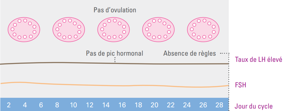 En cas de SOPK, le taux de ces hormones varie généralement peu au cours du cycle. Le taux de base de LH est plus haut que celui de FSH et n’augmente pas en milieu du cycle. Cette LH élevée est à l’origine de la surproduction d’androgènes ovariens. Ainsi, les ovaires ne reçoivent pas les bons messages et le cycle menstruel est perturbé.