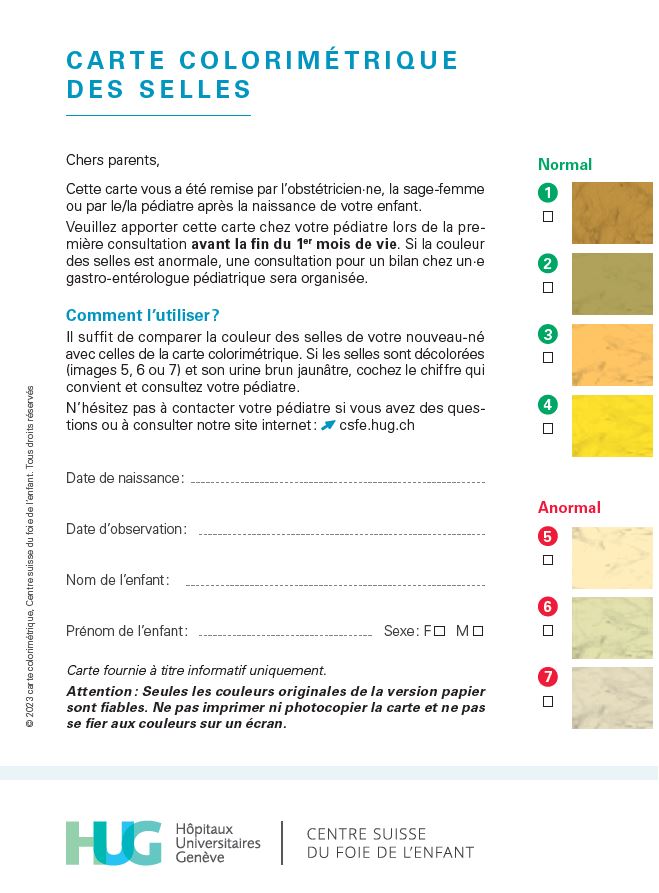 En Suisse, une étude nationale dirigée par le Centre suisse du foie de l’enfant entre 2009 et 2015 a permis d’introduire un dépistage précoce de l’atrésie des voies biliaires chez le nouveau-né. Ce dépistage repose sur l’observation de la couleur des selles à l’aide d’une échelle colorimétrique, disponible dans le carnet de santé de l’enfant (page 7). Ce carnet est remis aux parents par l’obstétricien, la sage-femme ou le pédiatre après la naissance.