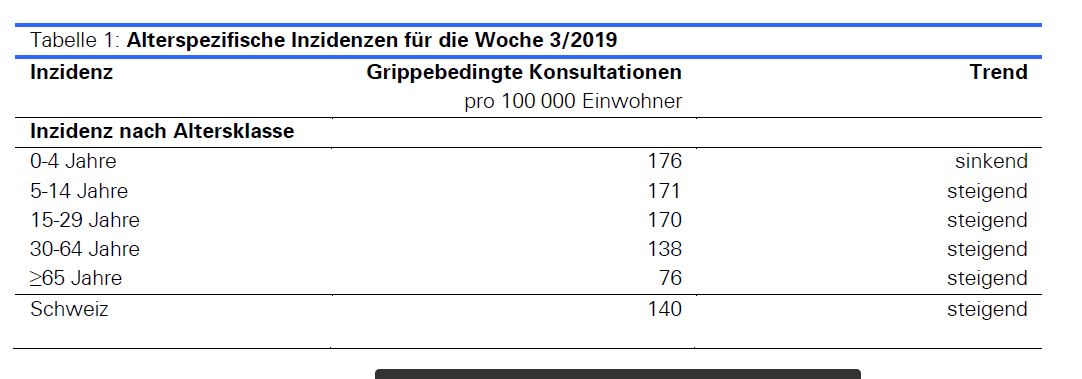Grippeähnliche Erkrankungen sind schweizweit weit verbreitet. Während der Woche 3/2019 wurden von 142 Ärztinnen und Ärzten des Sentinella-Meldesystems 17,3 Grippeverdachtsfälle pro 1000 Konsultationen gemeldet. Dies entspricht hochgerechnet einer Inzidenz von 140 Fällen pro 100 000 Einwohner.