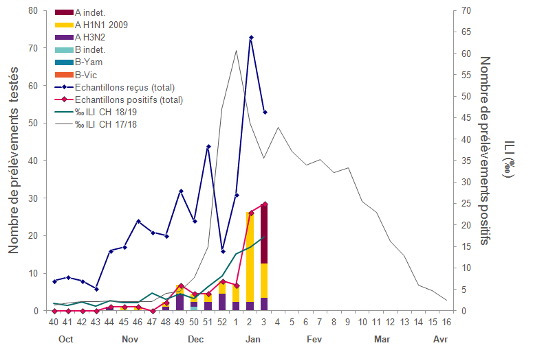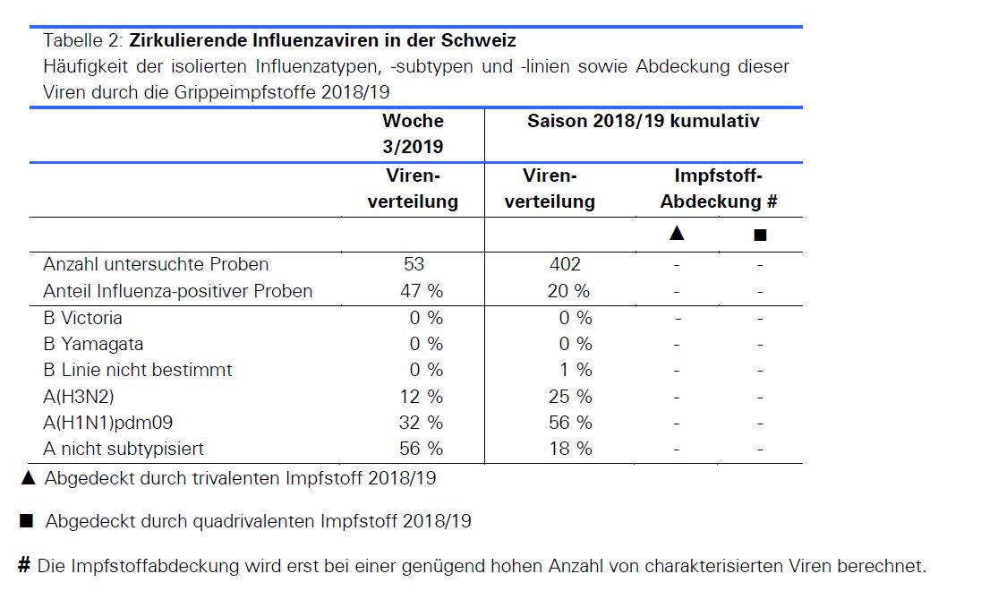 In der Woche 3/2019 wies das Nationale Referenzzentrum für Influenza (CNRI) in Genf im Rahmen der Sentinella-Überwachung in 25 der 53 untersuchten Abstriche Influenza A Viren nach (Tabelle 2).