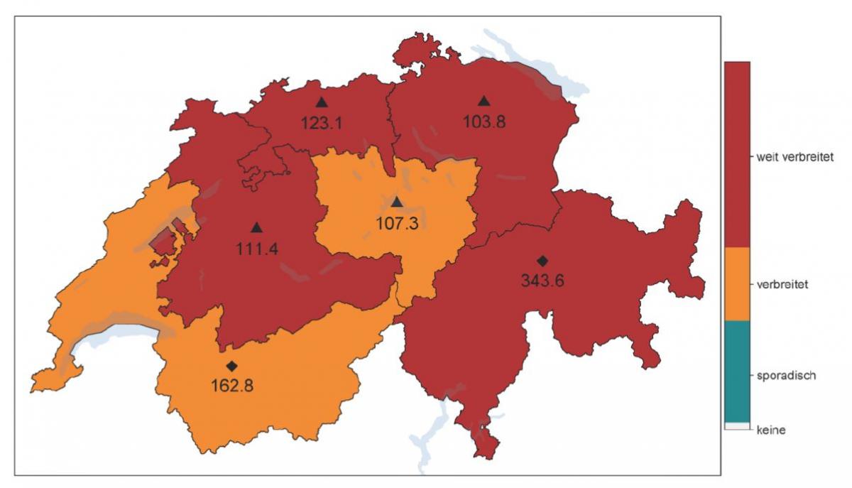 Die Inzidenz war in der Altersklasse der 0- bis 4-Jährigen am höchsten (Tabelle 1). Die Grippe ist in den Regionen 1 (GE, NE, VD, VS) und 4 (LU, NW, OW, SZ, UR, ZG) verbreitet, und in den Regionen 2 (BE, FR, JU), 3 (AG, BL, BS, SO), 5 (AI, AR, GL, SG, SH, TG, ZH) und 6 (GR, TI) weit verbreitet (Grafik 2, Kasten). In Regionen 2,3,5 und 6 sowie in allen Altersklassen ausser in der Altersklasse der 0- bis 4-Jährigen ist die Inzidenz steigend.