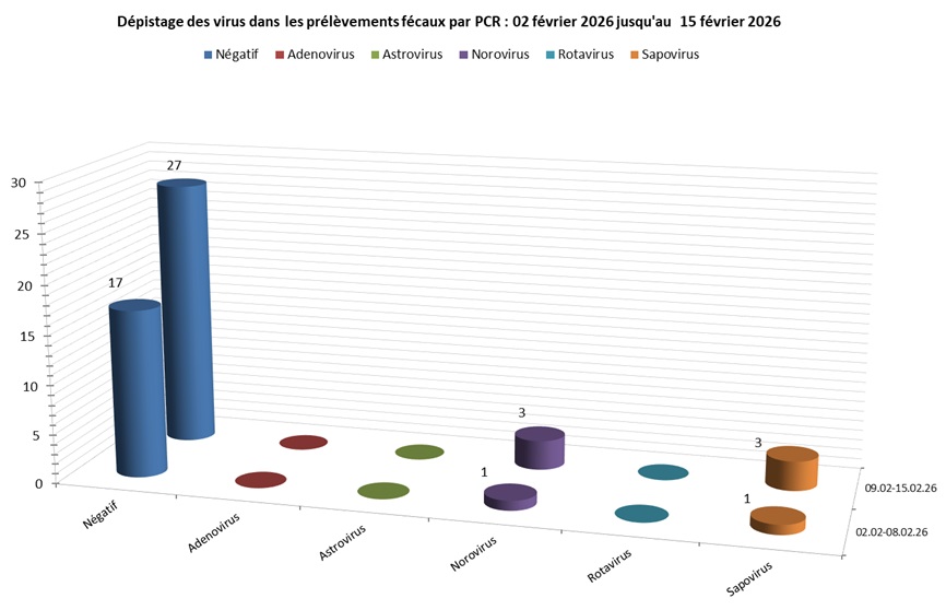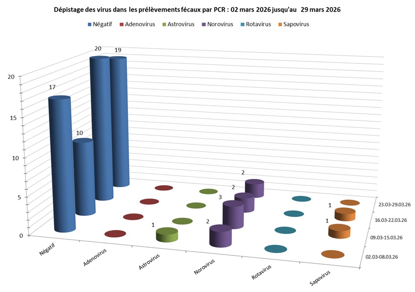 Ces résultats représentent les différents screening effectués dans des selles reçues dans notre laboratoire et ne peuvent donc être considérés comme représentatifs des infections virales du tractus digestif circulant dans la communauté. Les statistiques présentées sont une vision brute de nos résultats et peuvent être modifiés ou ajustés en tout temps.