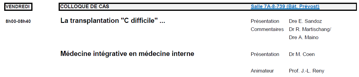 Tous les vendredis de 8h00 à 8h45, le colloque organisé par le Service de Médecine Interne Générale (SMIG), avec des présentations de cas cliniques commentés, se tient aux HUG (salle 8A-739).