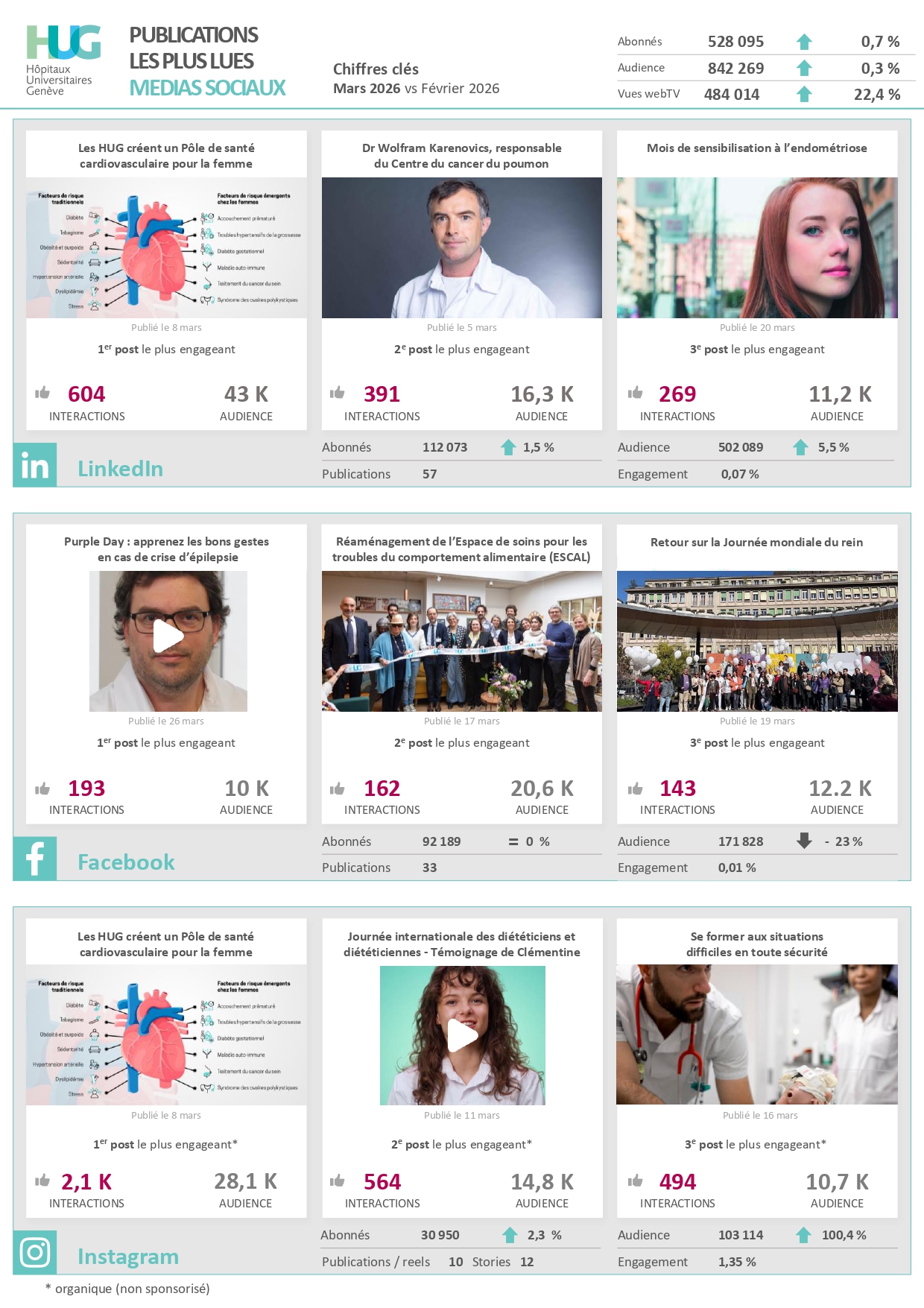 L'évolution des HUG et de son personnel a été largement commentée par le grand public avec les portraits de Valérie Bernard et du Pr Patrick Petignat ou encore la nouvelle prestation hôtelière et le nouveau dispositif d'accueil des personnes cérébrolésées à l'Hôpital Bellerive. Le post sur la qualité de l'accueil du nouveau personnel a été aussi particulièrement apprécié sur LinkedIn.