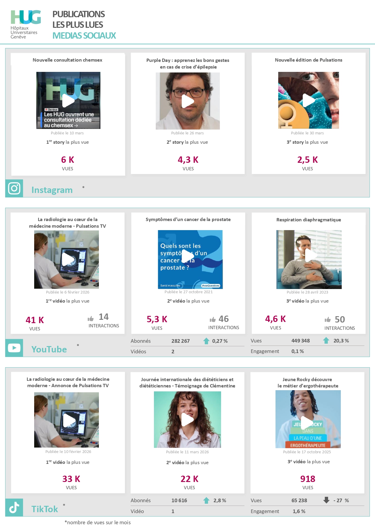 Le sujet ayant suscité le plus l'intérêt ce mois-ci est l'inauguration des urgences adultes. D'autres contenus tels que les vidéos de promotion pour la journée romande du diabète et pour le Forum Geneva, le retour en image sur la Journée mondiale du cœur, ou encore les remises de prix (pour un apprenti ASSC, au Congrès mondial des hôpitaux, et lors de la journée de l'innovation) ont également été très appréciés. Les thématiques de santé publique rencontrent également de belles performances, à noter ce mois-ci le cancer de la prostate, la cohérence cardiaque et la psychiatrie gériatrique.