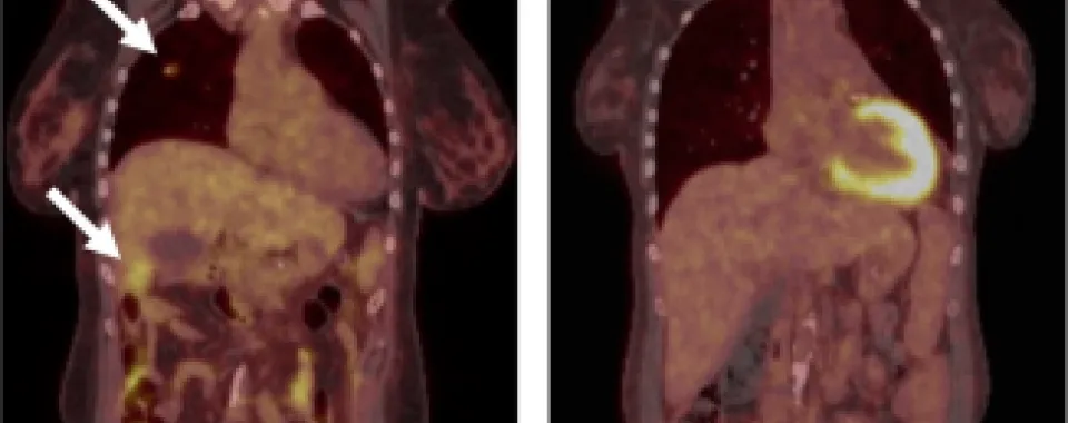 Légende de l'illustration: PET-CT-scanner montrant la tumeur du rein avec les métastases hépatiques et pulmonaires (gauche, flèches). PET-CT-scanner après la disparition complète des tumeurs à 6 mois (droite).