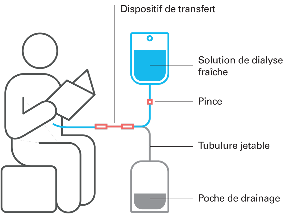 Un liquide stérile appelé « dialysat » est introduit dans la cavité péritonéale, l’espace virtuel délimité par le péritoine. On utilise pour cela un cathéter qui aura été implanté chirurgicalement deux à trois semaines avant le début du traitement. Le dialysat séjourne ensuite quelques heures dans la cavité péritonéale afin que les toxines et l’excès d’eau dans tout l'organisme y soient transférés. Le dialysat est ensuite drainé par le cathéter et éliminé.