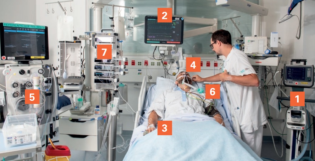 - Respirateur: appareil permettant la respiration artificielle en cas de troubles respiratoires ou de manque d’oxygène. Il est branché à un tuyau mis en place dans la trachée (6) (intubation). Lorsque la ou le patient est capable de maintenir sa respiration et son oxygénation à un niveau suffisant, le tuyau est retiré (extubation).